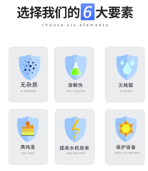 使用后无任何残留物,无任何气味。同等情况下效果及用量大大优于其他再生剂,能更好的保证用水质量,解除水机经常堵塞的烦恼,不搭桥不起拱,用量少分解缓慢,水质饱和以后不再分解;真正意义上的省时省力,环保节约!