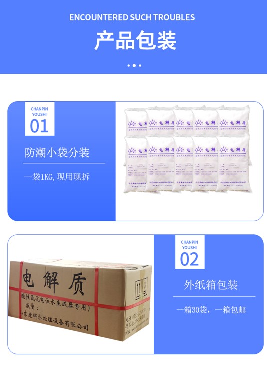 专用电解质性能优于其它NaCL溶解充分、速度快,能使电解效率提高,残留氯减少,腐蚀性降低,电解槽寿命延长,高效能保护设备使您的水质更加干净、清澈,长期保持给水管道通畅、无异物堵塞